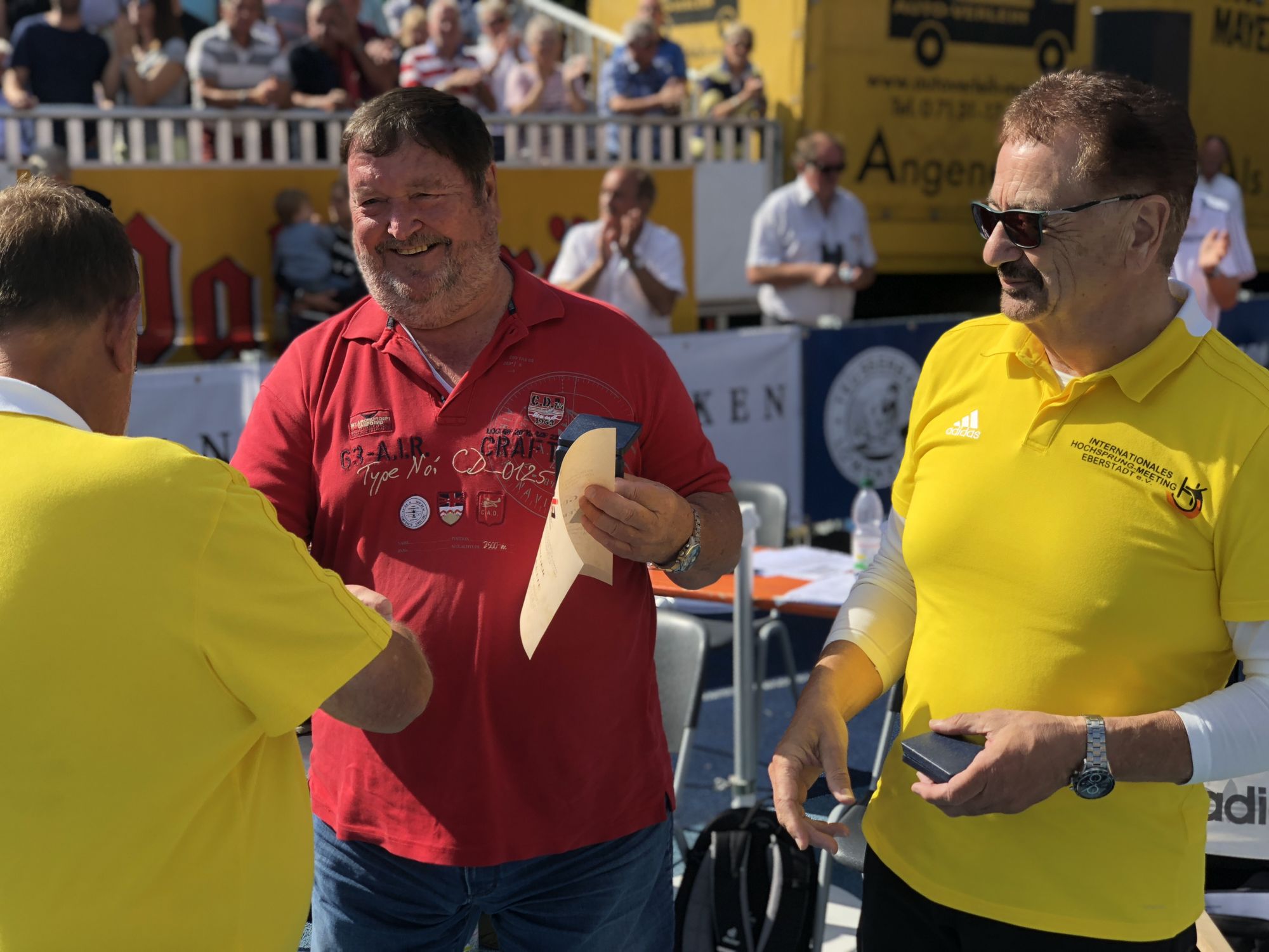 Meetingdirektor und WLV Ehrenmitglied Peter Schramm hielt nach dem Hochsprungwettbewerb der Männer eine emotionale Laudatio, in der er seine Mitstreiter und inzwischen engen Freunde für ihre Verdienste um das Hochsprungmeeting in Eberstadt würdigte. Günter Eisinger - ehemaliger Trainer von Ariane Friedrich - kümmert sich seit Jahren um das Athletenmanagement und sorgte jährlich dafür, dass die besten Hochspringerinnen und Hochspringer der ganzen Welt nach Eberstadt kommen, um sich unter den Augen des fachkundigen Publikums in neue Höhen zu schrauben.